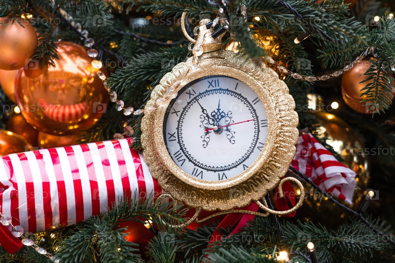 Часы на рождественской елке показывают Новый год. Руки часов показывают 12 часов ночью. Прекрасный фон для Нового года или Рождества 2026 года