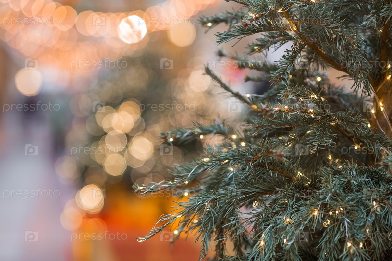 Новогодняя открытка 2026. Праздничные гирлянды и огни на рождественской елке. Близко. Прекрасный рождественский фон. Концепция декораций и декораций к Новому году