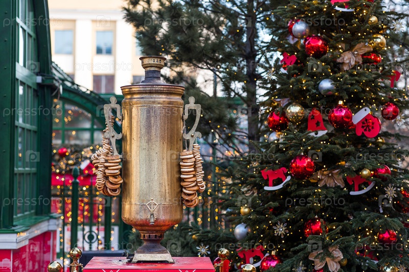 Большой самовар с багелями и багелями на Тверской улице. Горячий чай из традиционного русского самовара. Россия, Москва