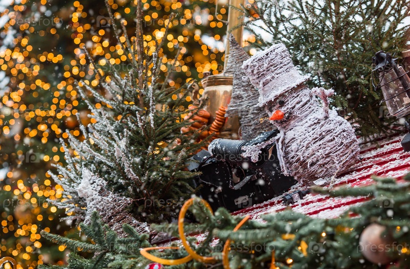 Красивые праздничные игрушки и снеговик на елке в Москве. Прекрасный рождественский фон. Концепция подготовки и декорирования к новому году. Новогодняя открытка 2026