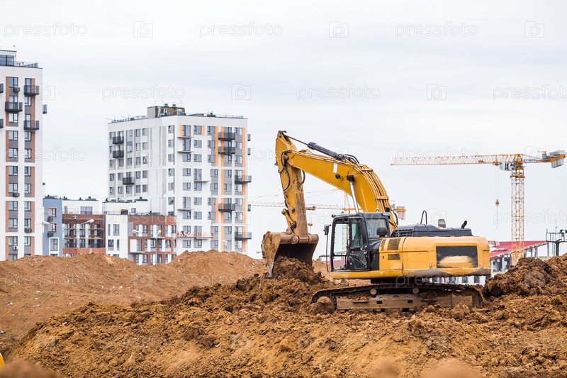 Экскаватор на строительной площадке крупным планом. Экскаватор выкапывает землю ведром для строительства. Тяжелая техника для строительства и озеленения