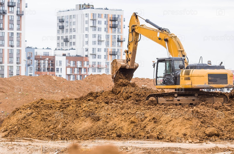 Экскаватор на строительной площадке крупным планом. Экскаватор выкапывает землю ведром для строительства. Тяжелая техника для строительства и озеленения