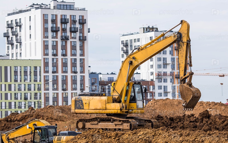 Экскаватор на строительной площадке крупным планом. Экскаватор выкапывает землю ведром для строительства. Тяжелая техника для строительства и озеленения
