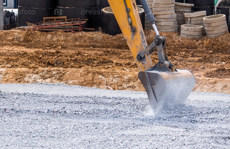 Экскаватор на строительной площадке крупным планом. Экскаватор таранит измельченный камень ведром для строительства. Тяжелая техника для строительства и озеленения