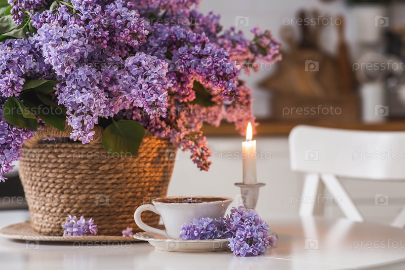 Большой фиолетовый букет лиловых цветов в корзине из уксуса, чашка чая и свечи на столе.На заднем плане интерьер современной белой кухни.Концепция домашнего комфорта