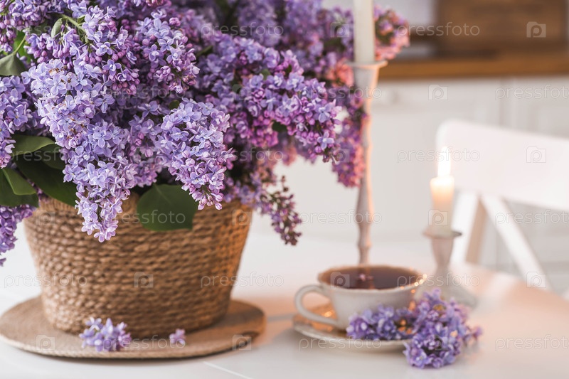 Большой фиолетовый букет сирен в плетеной корзине, чашка чая и свечи на столе. На заднем плане находится интерьер современной белой кухни. Концепция домашнего комфорта