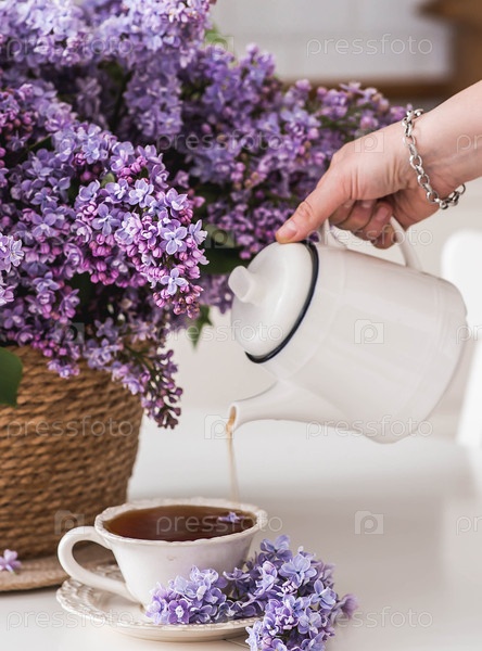 Фиолетовый букет сирен в плетеной корзине и женская рука заливает чай в кружку из чайника. На заднем плане находится интерьер современной белой кухни. Концепция домашнего комфорта