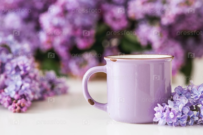 Чашка чая или кофе на столе. На заднем плане большой фиолетовый букет сирен. Концепция домашнего комфорта и напитков