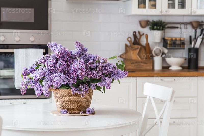 Большой фиолетовый букет сирен на столе в плетеной корзине. На заднем плане находится интерьер современной белой кухни. Концепция домашнего уюта и праздника