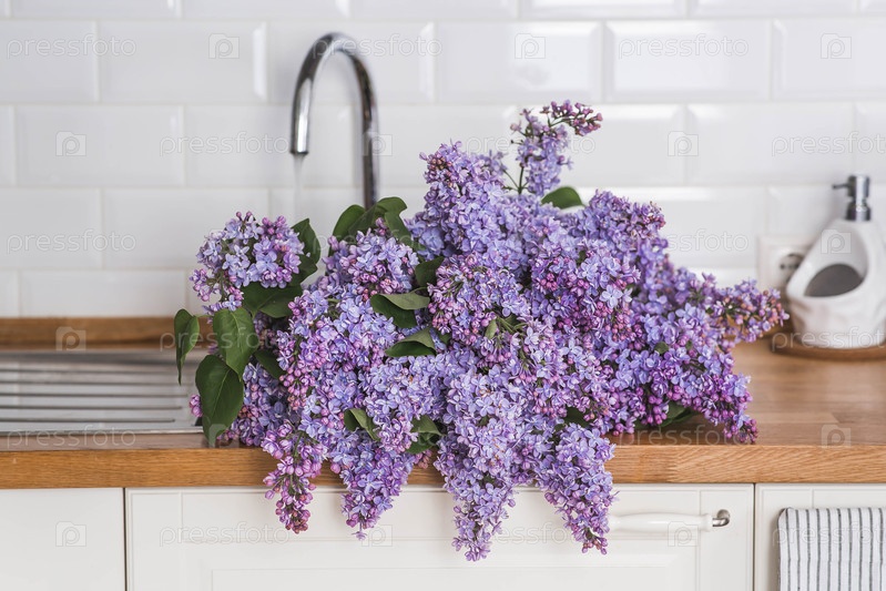 Большой фиолетовый букет сирен в раковине или раковине на кухне. На заднем плане находится интерьер современной, стильной, яркой кухни. Концепция домашнего комфорта