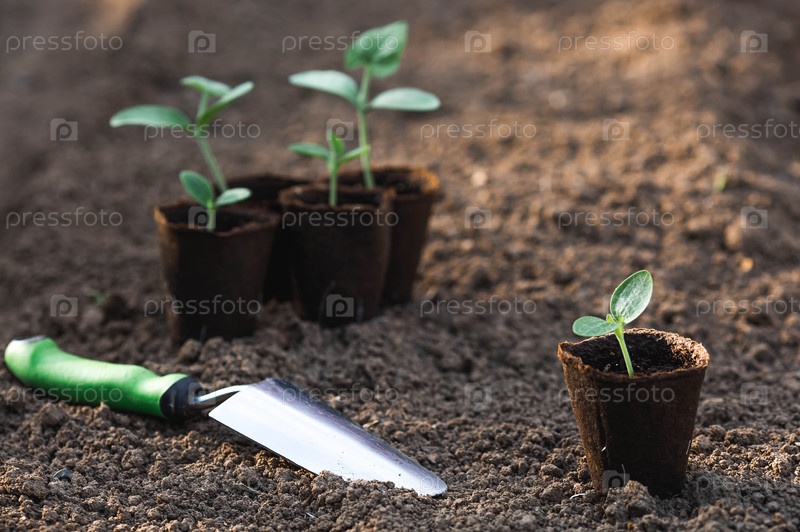 Спатула и овощные саженцы в торфяных горшках высаживаются в грунт. Концепция весенней посадки овощей и земледелия