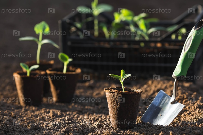 Спатула и овощные саженцы в торфяных горшках высаживаются в грунт. Концепция весенней посадки овощей и земледелия