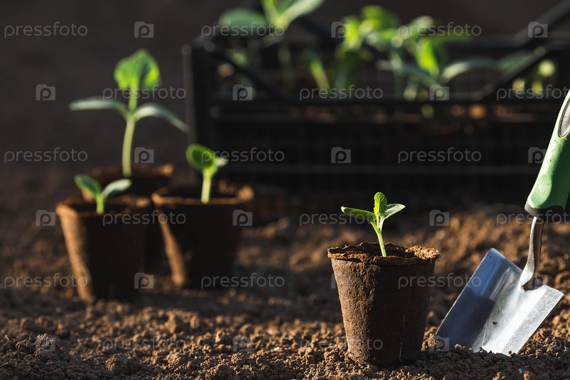 Спатула и овощные саженцы в торфяных горшках высаживаются в грунт. Концепция весенней посадки овощей и земледелия