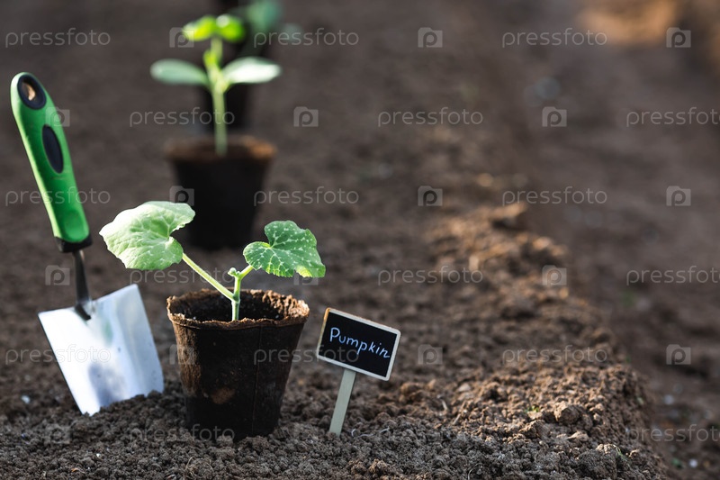 Плечевое лезвие и тыквенные саженцы высаживают в землю. Концепция весенней посадки овощей и земледелия. Знак с надписью тыква