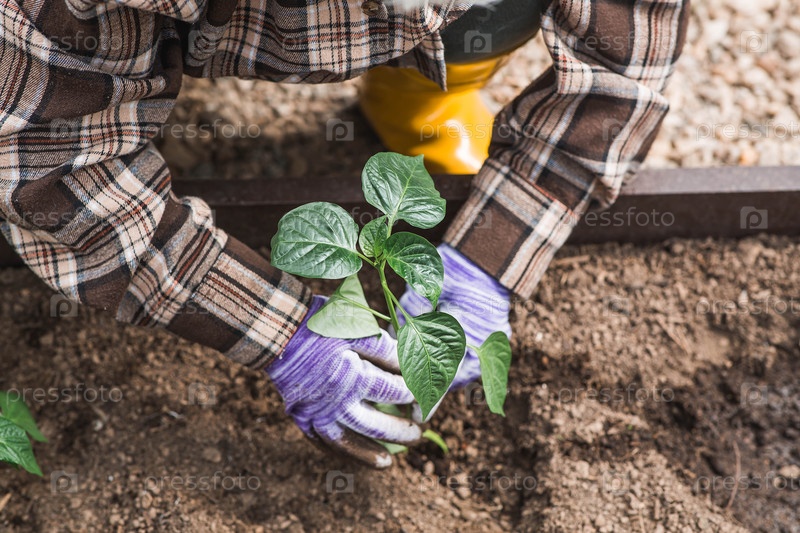 Пожилая женщина в садовых перчатках сажает молодое растение в землю. Семена колокольного перца высаживают в землю. Концепция весенней посадки овощей и сельского хозяйства