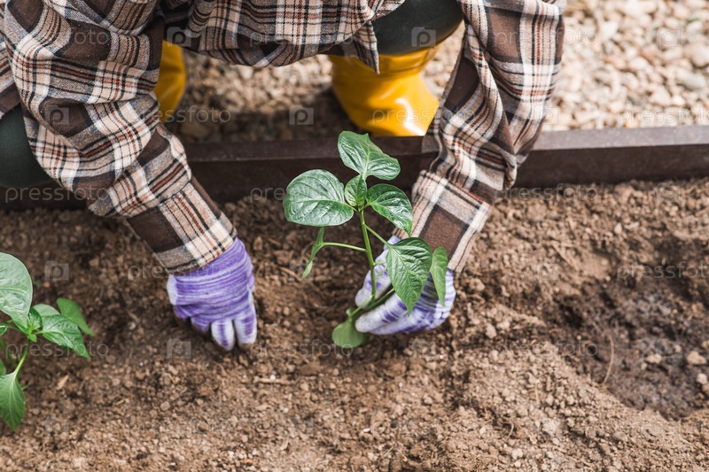Пожилая женщина в садовых перчатках сажает молодое растение в землю. Семена колокольного перца высаживают в землю. Концепция весенней посадки овощей и сельского хозяйства