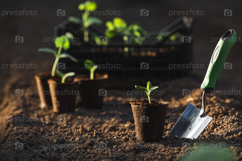 Спатула и овощные саженцы в торфяных горшках высаживаются в грунт. Концепция весенней посадки овощей и земледелия