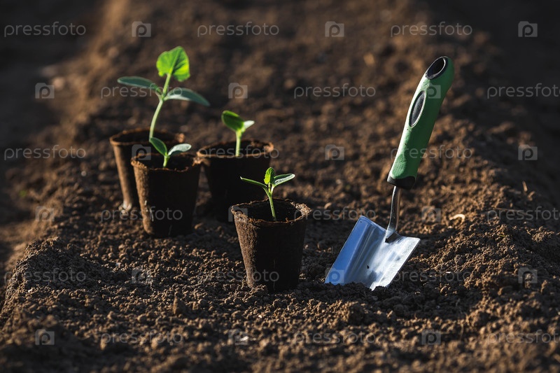 Спатула и овощные саженцы в торфяных горшках высаживаются в грунт. Концепция весенней посадки овощей и земледелия