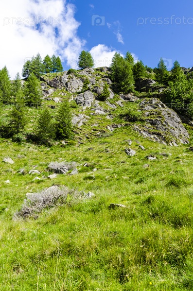 Летний альпийский пейзаж в северной Италии.Цветящие склоны в районе Понте ди Легно