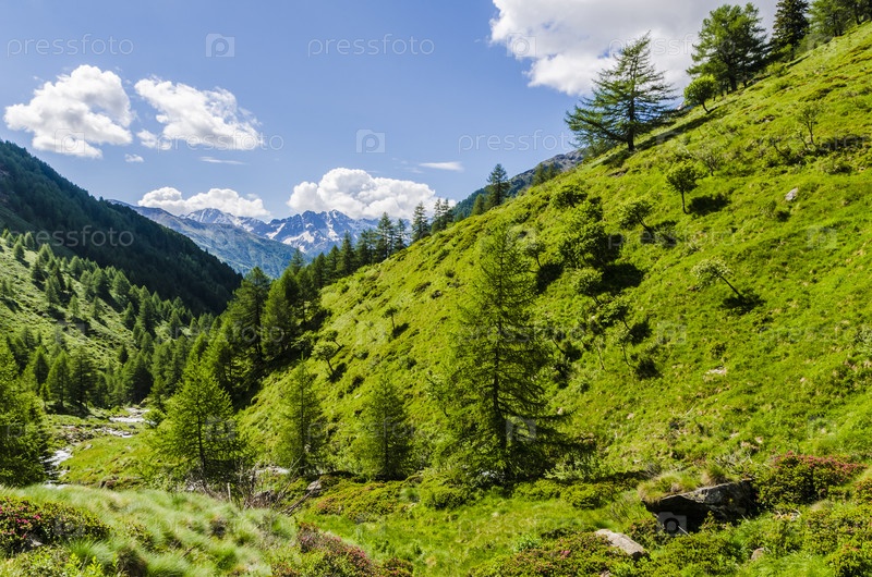 Летний альпийский пейзаж в северной Италии.Цветящие склоны в районе Понте ди Легно