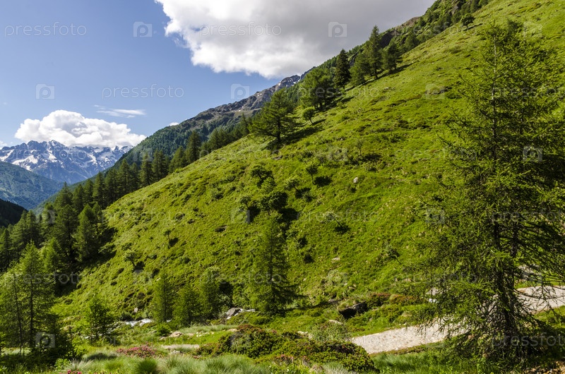 Летний альпийский пейзаж в северной Италии.Цветящие склоны в районе Понте ди Легно