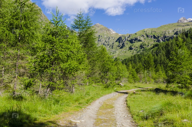 Дорога в альпах, луга и горные вершины. Италия