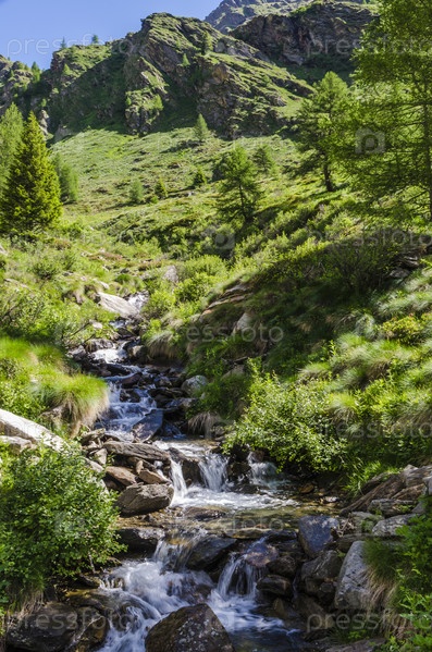 Бурная горная речка, луга и горные вершины. Италия