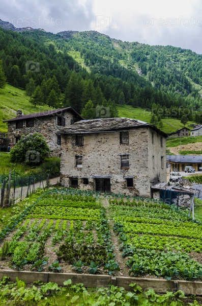 Альпийская деревняю Каменные домики в горах