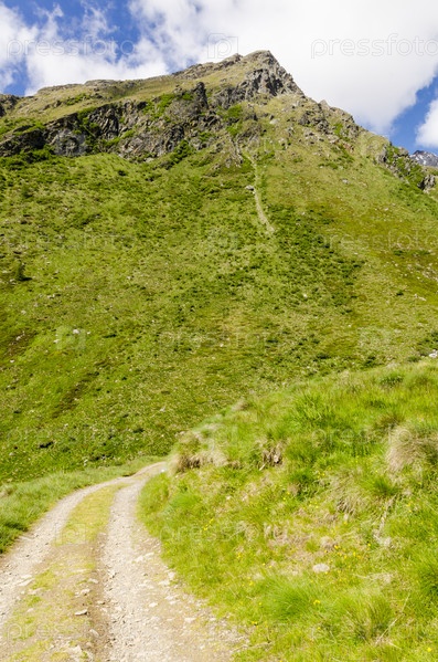 Дорога в альпах, луга и горные вершины. Италия