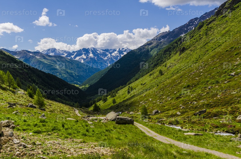 Альпийский пейзаж. Зеленая долина на фоне горных вершин