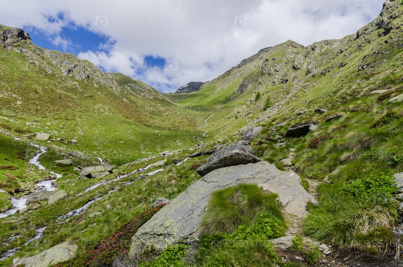 Альпийский пейзаж. Зеленая долина на фоне горных вершин