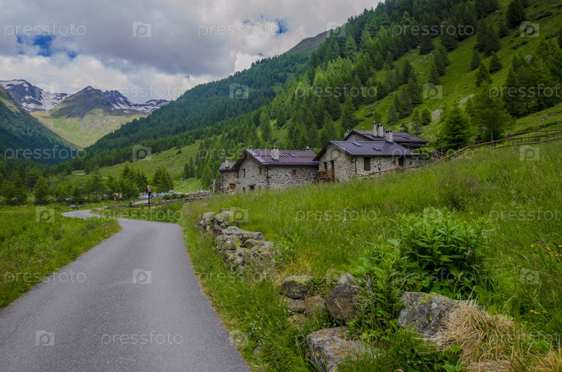 Альпийский пейзаж. Каменные домики в альпийской пастушьей деревне