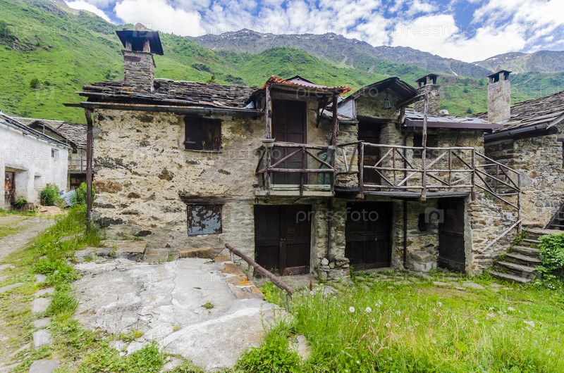Альпийский пейзаж. Каменные домики в альпийской пастушьей деревне