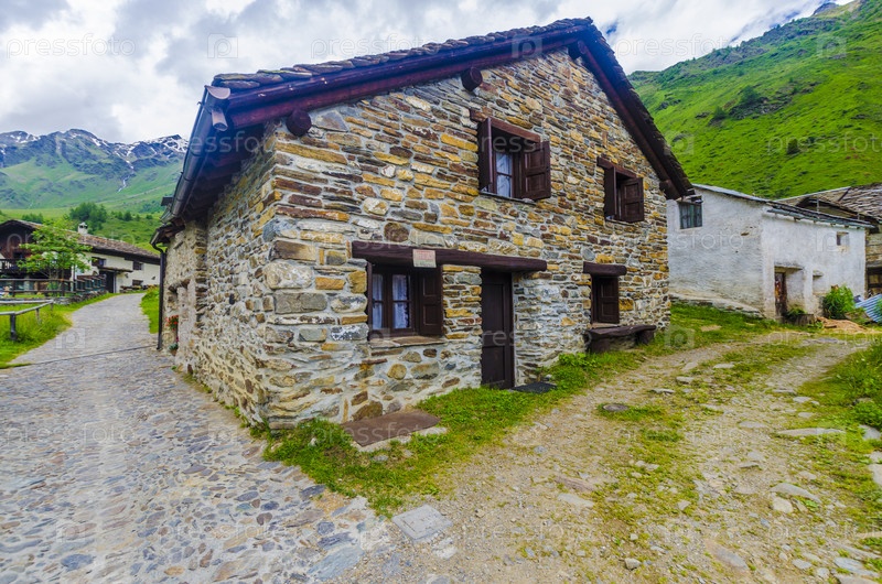 Альпийский пейзаж. Каменные домики в альпийской пастушьей деревне