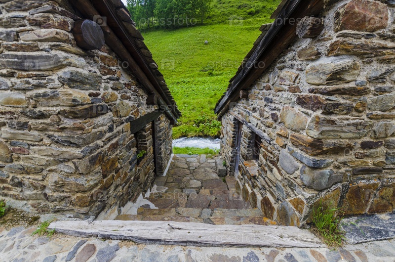 Альпийский пейзаж. Каменные домики в альпийской пастушьей деревне