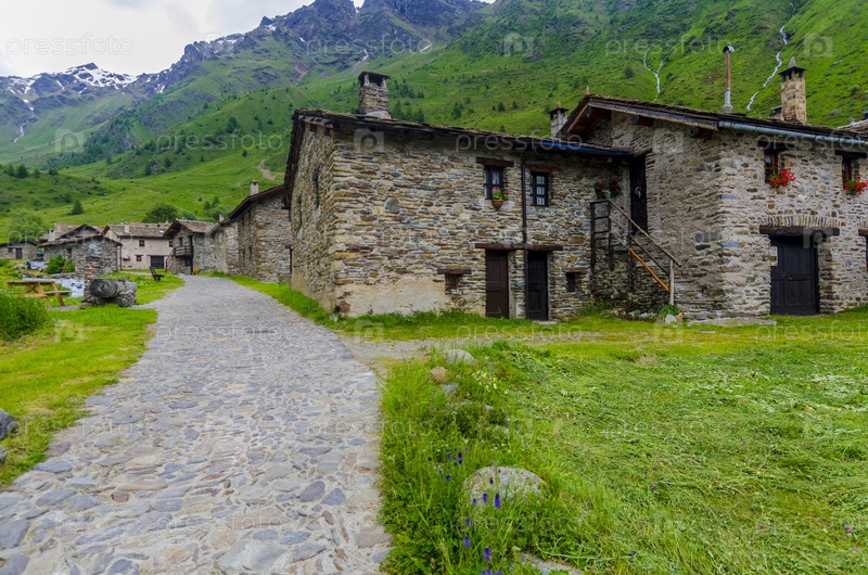 Альпийский пейзаж. Каменные домики в альпийской пастушьей деревне