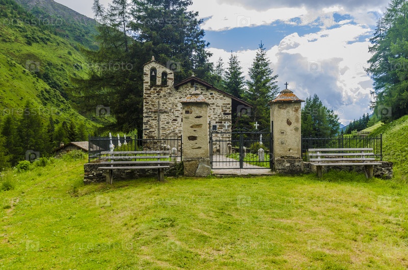 Каменная католическая церковь на кладбище в алтпийской пастушьей деревне. Северная Италия