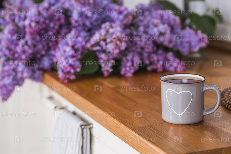 Серая чашка чая или кофе с сердцем на кухонной столешнице На заднем плане большой фиолетовый букет сирен. Концепция домашнего комфорта и напитков
