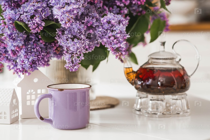 Большой фиолетовый букет сирен, белые скандинавские дома, керамический чайник и чашка на столе. На заднем плане находится интерьер современной белой кухни. Концепция домашнего комфорта