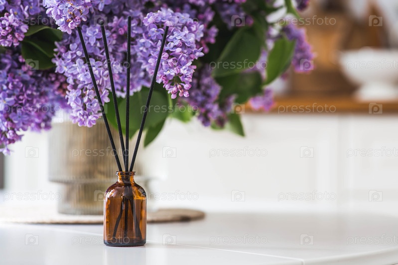 Диффузор аромата. Весенние духи с сиренью для дома в стеклянной бутылке с палочками для еды в качестве освежителя воздуха в доме. Ароматерапия, уютная атмосфера, комфорт и расслабление