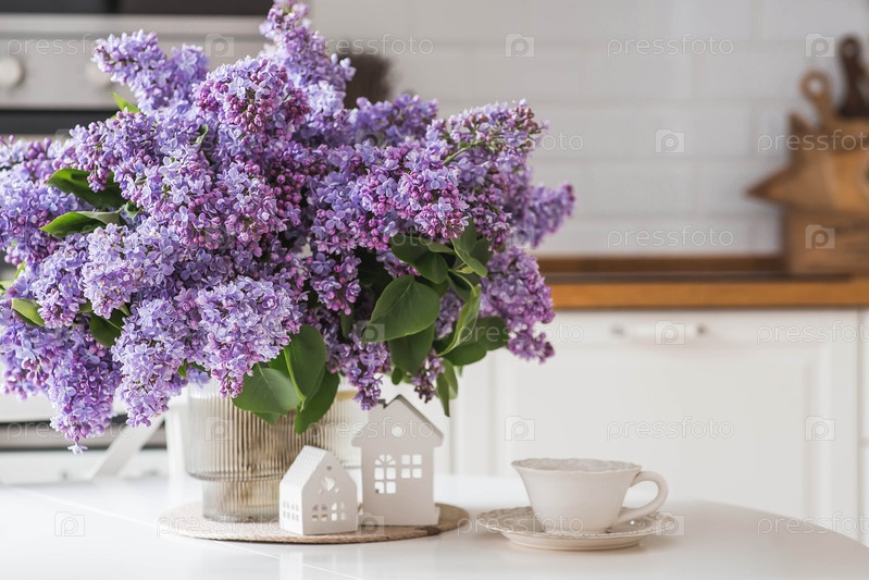 Большой фиолетовый букет сирен, белые скандинавские дома и чашка чая на столе. На заднем плане находится интерьер современной белой кухни. Концепция домашнего комфорта