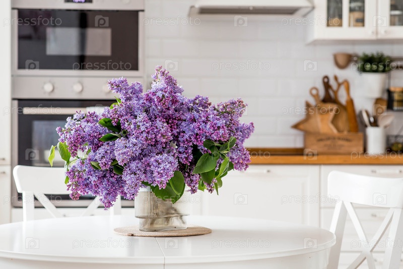 Большой фиолетовый букет сирен на столе. На заднем плане находится интерьер современной белой кухни в скандинавском стиле. Концепция домашнего уюта и праздника