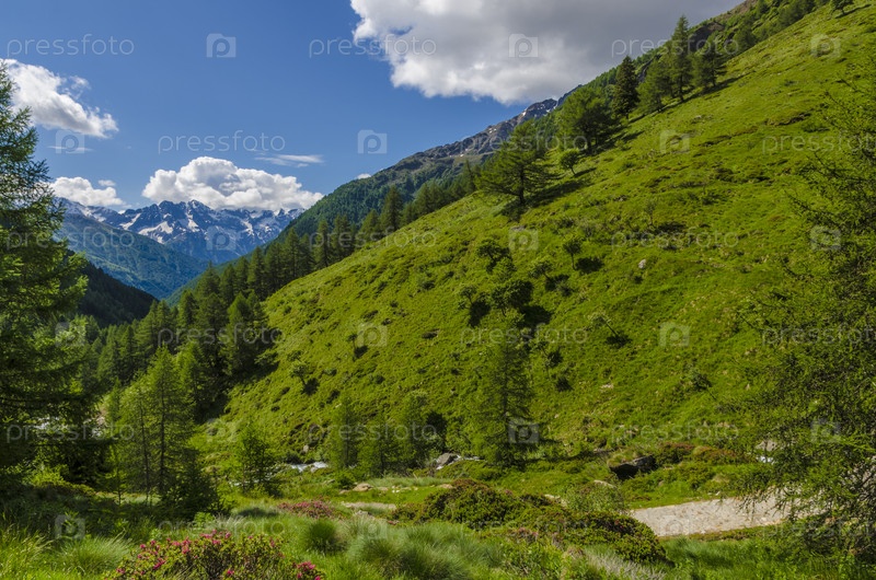 Летний альпийский пейзаж в северной Италии.Цветящие склоны в районе Понте ди Легно