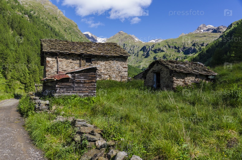 Летний Альпийский пейзаж в северной Италии. Каменные домики в альпийской деревне
