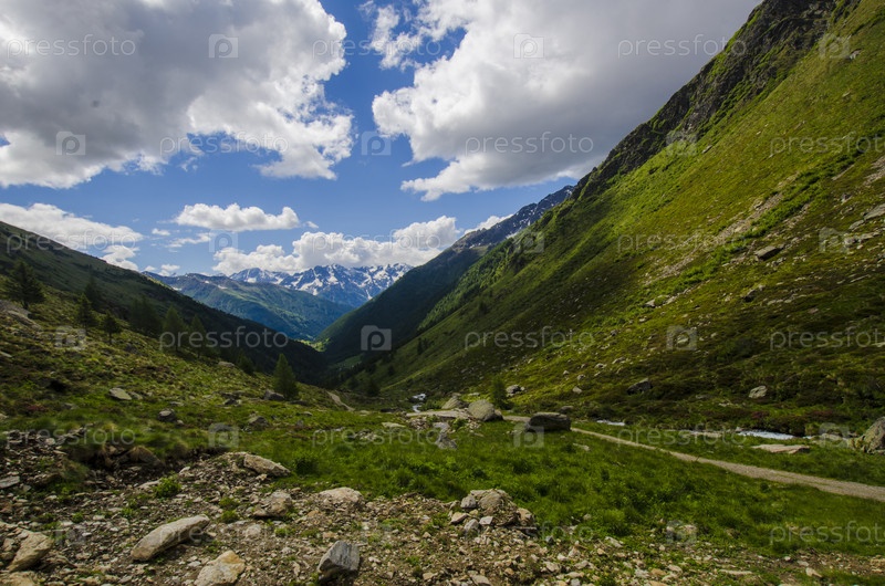 Альпийский пейзаж. Зеленая долина на фоне горных вершин