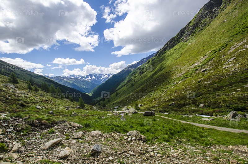 Альпийский пейзаж. Зеленая долина на фоне горных вершин