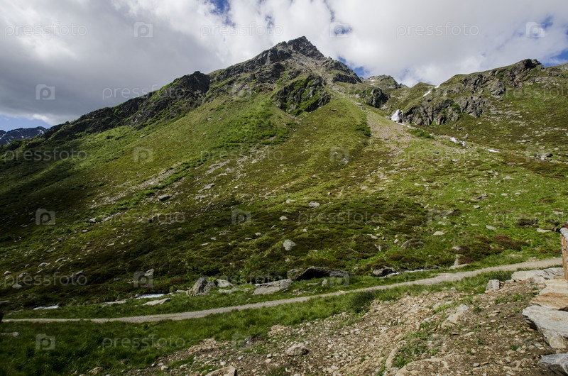 Альпийский пейзаж. Зеленая долина на фоне горных вершин