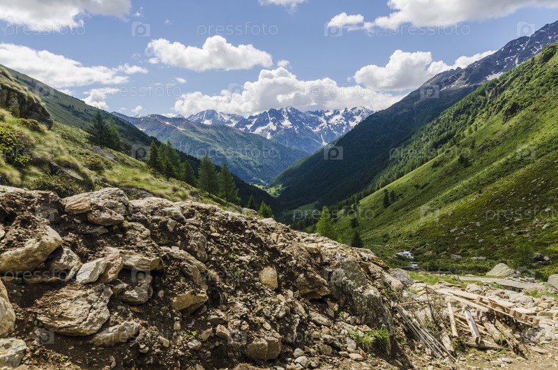 Альпийский пейзаж. Зеленая долина на фоне горных вершин