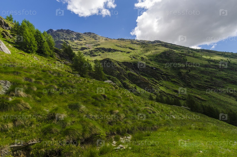 Альпийский пейзаж. Зеленая долина на фоне горных вершин