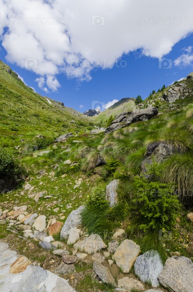 Альпийский пейзаж. Зеленая долина на фоне горных вершин